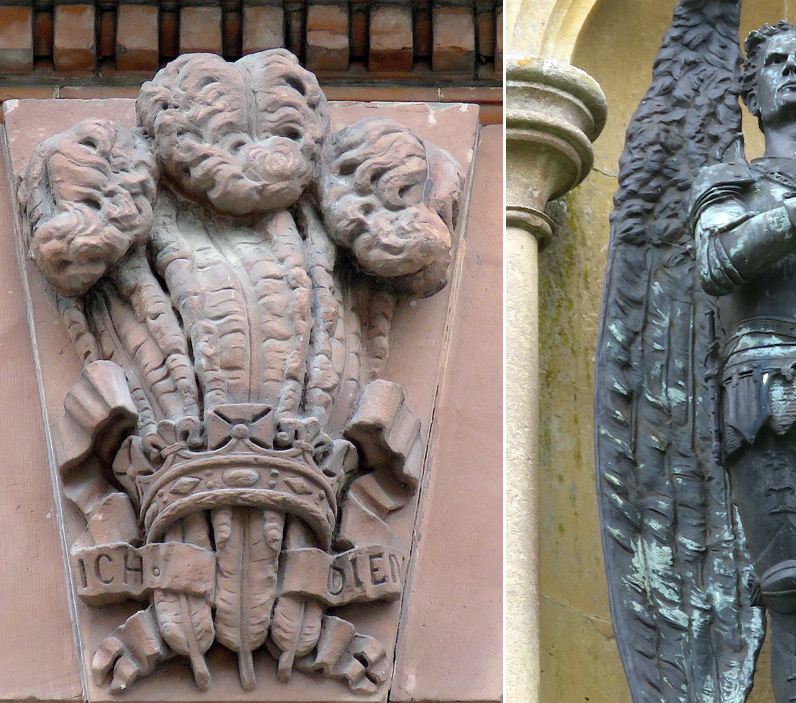 Recently revisiting the carving of the Prince of Wales feathers on the Agricultural Hall I had the impression that I’d seen this way of handling feathers before. Comparison of the brick feathers with the wings on the Booton bronze shows they share stylistic traits: a rather fluffy treatment of the top of the feather and wing compared to the transverse barbs below. They could well be by the same carver/sculptor.