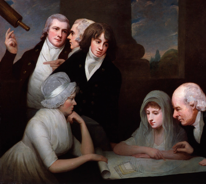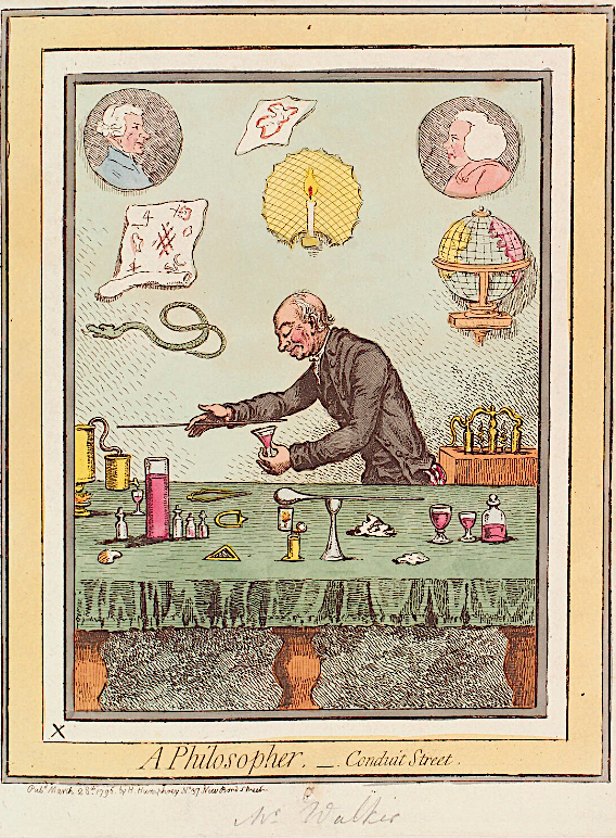 Adam Walker was sufficiently famous to have had his portrait painted by the most fashionable artist of the day, George Romney, and to be portrayed by the great caricaturist, James Gillray. In the background of Gillray’s cartoon we see a portrait of Joseph Priestley FRS, top left, while Adam Walker delivers a lecture at his house in Conduit Street, London. Priestley was a natural philosopher (nowadays, a scientist) famed for his writings on electricity and his experimental chemistry.