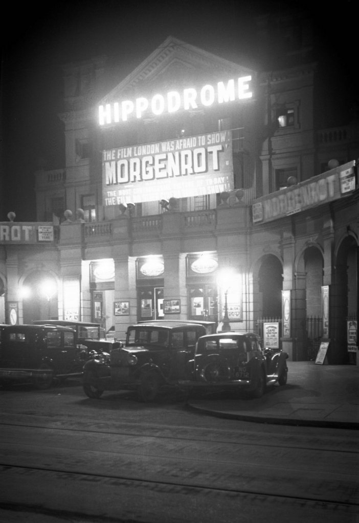 George Plunkett’s photograph illustrates The Hippodrome at a time when it was showing ‘The film that London was afraid to show’. This was Morgenrot (Dawn), directed by Gustav Ucicky (which he had changed from Gustav Klimt) and approved by the Nazi minister for propaganda, Joseph Goebbels. The film depicts the lives of German sailors trapped in a U-boat during World War I. In World War II, The Hippodrome took a direct hit from a German bomb, which killed the theatre manager, his wife and a sea lion trainer. From 1966, the site was to become the St Giles car park.