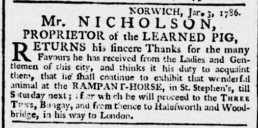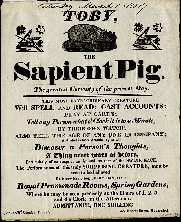 There have been many clever pigs but this animal, ‘Toby, The Amazing Pig of Knowledge’, was the pig trained by Samuel Bissett [16]. After Bissett died as a result of being assaulted by a man with a sword, Toby was bought by a Mr Nicholson who brought him to Norwich.