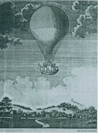 Joseph Decker (or Deeker) visited Norwich before travelling to Bristol then taking his balloon to America. His balloon was 25 feet in diameter, beneath which was suspended, not a basket, but a gold and silver gondola (which became the name for the passenger compartment). The high ground with the windmill in the distance could be Mousehold Heath.