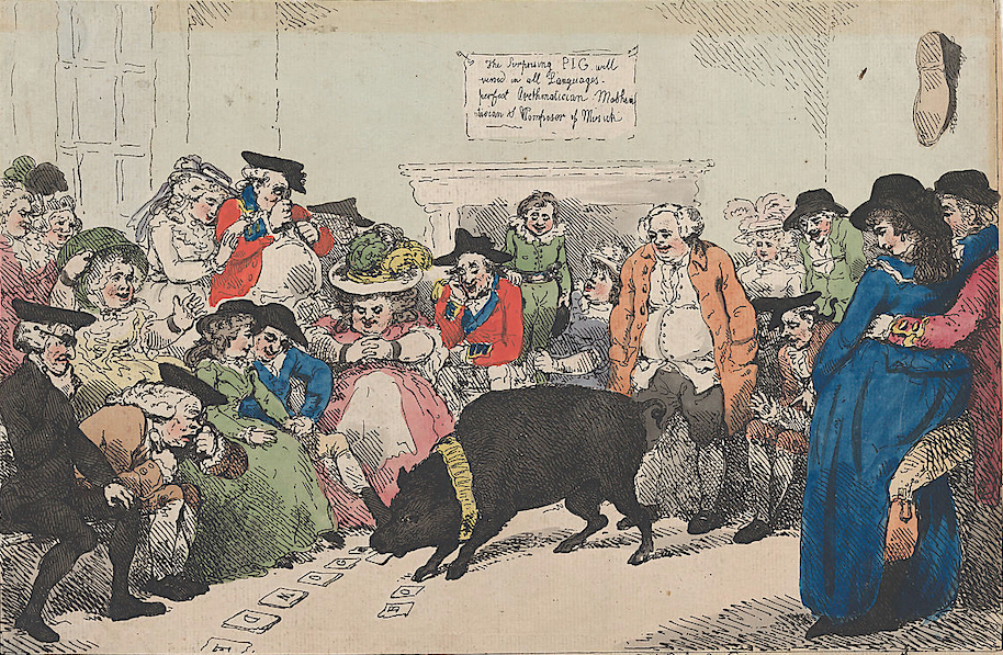 The Learned Pig achieved fame. Putting England’s most famous scientist in his place, the poet Southey (1807) said that the pig was, ‘a far greater object of admiration for the British nation than ever was Sir Isaac Newton.’ The animal gained a mention in Wordsworth’s Prelude (1805): ‘The horse of knowledge, and the learned pig’. He even crops up in the 2005 film of Pride and Prejudice, in which Mr Bennet says that their pig is not related to the Learned Pig of Norwich (except these words do not belong to Jane Austen but to screenwriter Deborah Moggach).