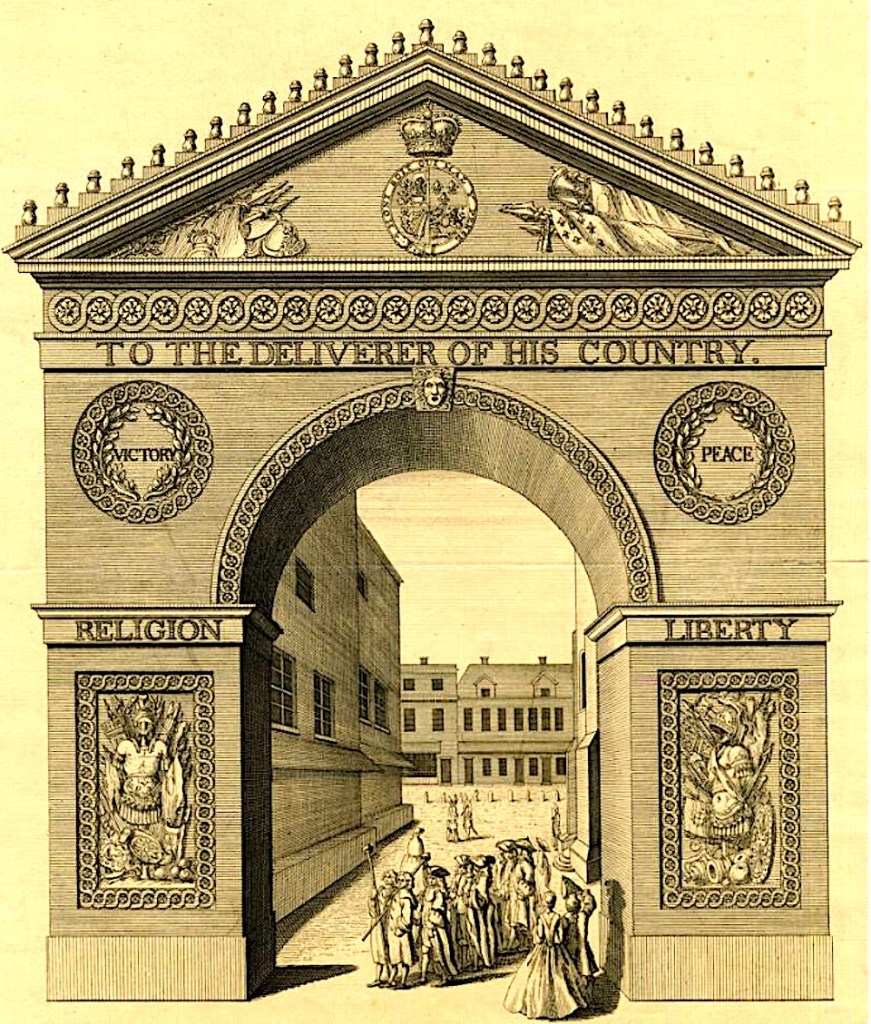 After the Catholic monarch, James II, attempted to impose absolute rule on the country but was resisted by the Glorious Revolution of 1688 in which he was displaced – bloodlessly – by the Protestant William of Orange and his wife Mary II. From this time, Norwich Tory sentiment was tinged with Jacobitism – support for the restoration of the Catholic House of Stuart (Jacobus = James). During the Jacobite Rebellion of 1745-6, Charles Edward Stuart’s army crossed the border, invading as far as Derby. When the Duke of Cumberland defeated the Jacobites at Culloden the Norwich Whigs celebrated with an extravagant feast and erected a triumphal arch in the marketplace. The structure was covered in 96 yards of Persian silk that allowed candles inside to highlight painted patriotic words, such as ‘Religion’ and ‘Liberty’.