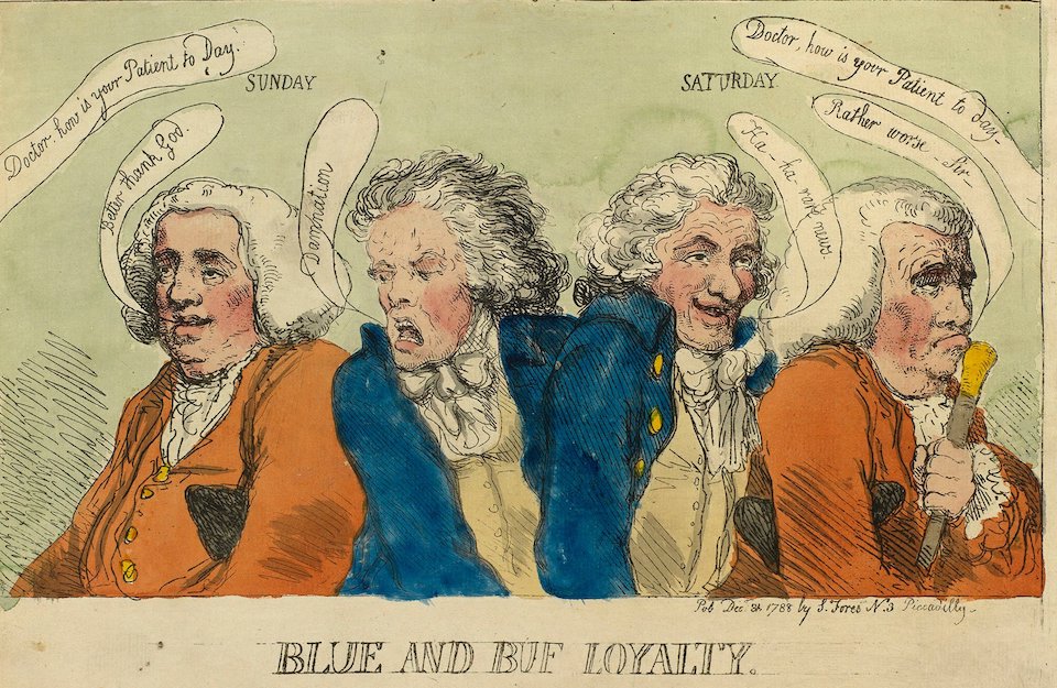 Windham was an enemy of the slave trade and should have been a favourite of Norwich’s intellectual left, which included abolitionists like Elizabeth Fry and Amelia Opie – the latter having travelled to France to see the revolution for herself [8]. However, his contradictory views on reform and his opposition to peace with France alienated the city’s Whigs. In 1794, this one-time Blue and White executed an about-turn when he became war minister on an Orange and Purple ticket [2]. Two years later, Parson Woodforde wrote, ‘Mr Wyndham very unpopular at present amongst the Revolutionists and which are great numbers at Norwich, especially Dissenters. Knuckle of Veal and boiled tongue for dinner to day.’