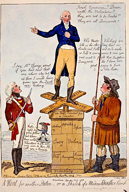 … but was chronically indecisive. In 1792, Windham supported the Ministry in calling out the militia, now voting for measures of which he had previously disapproved) [2]. Cruikshank’s parody of the MP as Weathercock Windham has him saying, “Down with the Volunteers !! … They are all Democrats!” To the right the common man says, “Why Master Whirligig … now you want us not to fight that Butcher Boneyparte...”.