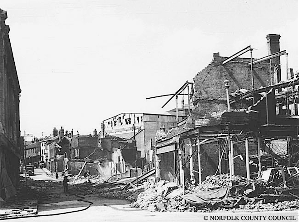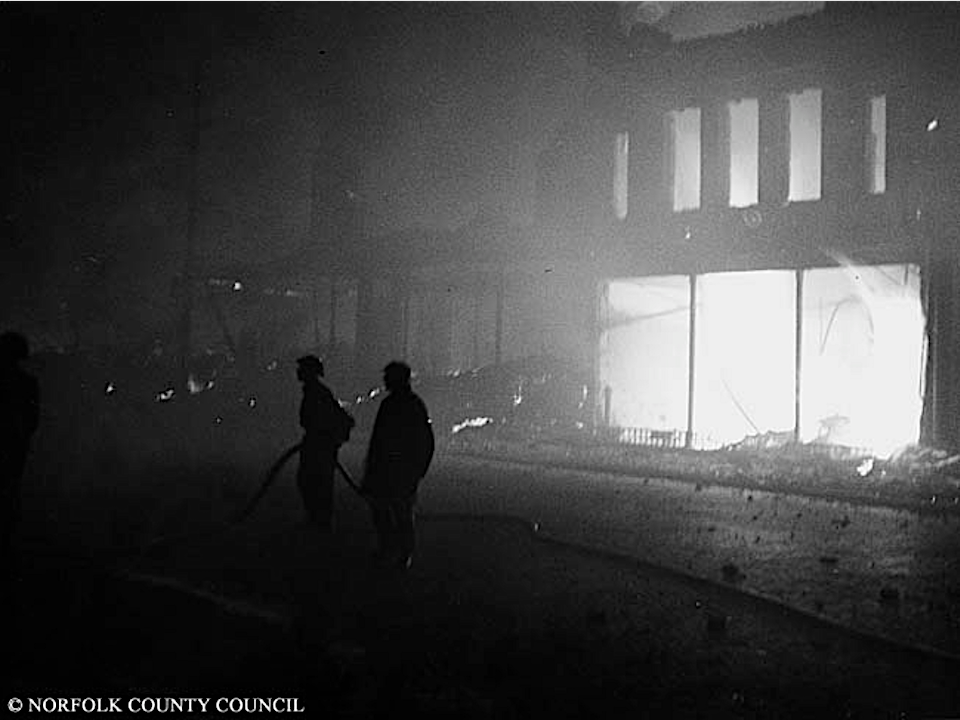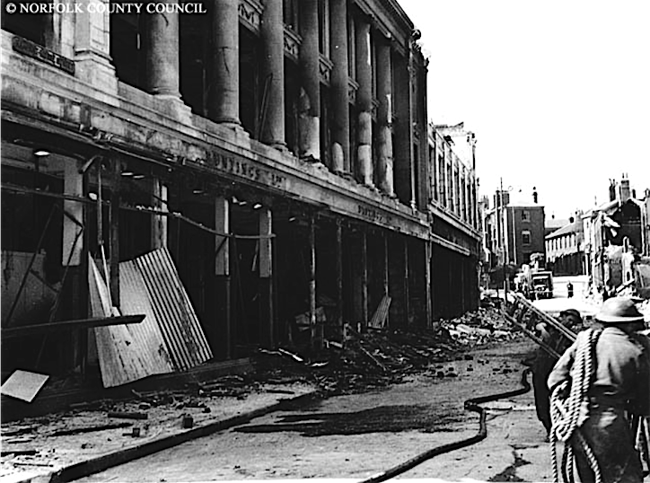 On the night of 29th April 1942, German planes dropped incendiary bombs. Three stores on Rampant Horse Street suffered heavily: Buntings, FW Woolworth & Co next door and Curl’s opposite.