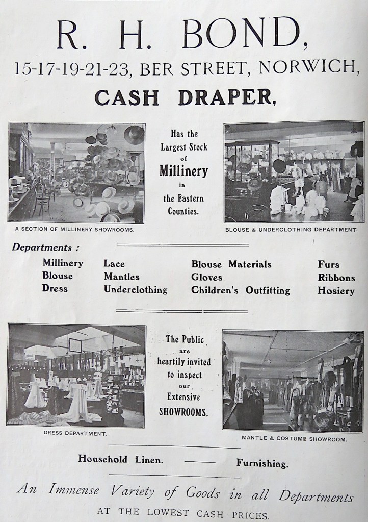 In 1879, Robert Herne Bond (b 1844) from Ludham in The Broads, started his business in Ber Street, Norwich, as a ‘Cash Draper’.