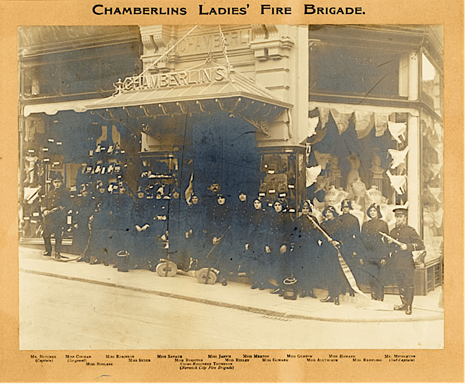 As a result of this disaster, water hydrants and hose reels were installed at the end of each floor of Chamberlins new building. Their ‘Ladies’ Fire Brigade’ is seen here during the First World War.