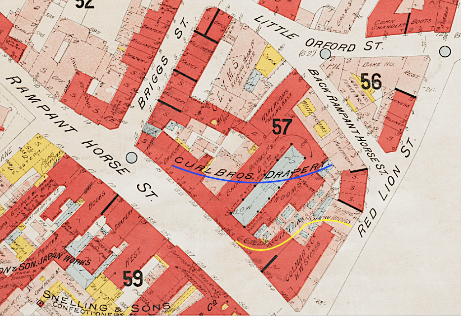This map just missed the great change to the east end of the store when, in 1902, the Curl brothers remodelled much of the shop and built a new extension along Orford Place [8].