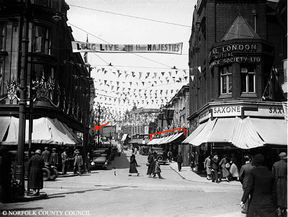 By the time of King George V’s Silver Jubilee in 1935, Woolworths were no longer located in the corner building (right). Instead, they had moved in 1929 to larger premises on the opposite side of Rampant Horse Street, adjacent to Buntings. This was to be the branch of Woolies destroyed in WWII (arrowed). Saxone shoes and an insurance company now occupied the corner spot. So, could those be the awnings of Curls department store further down the street?