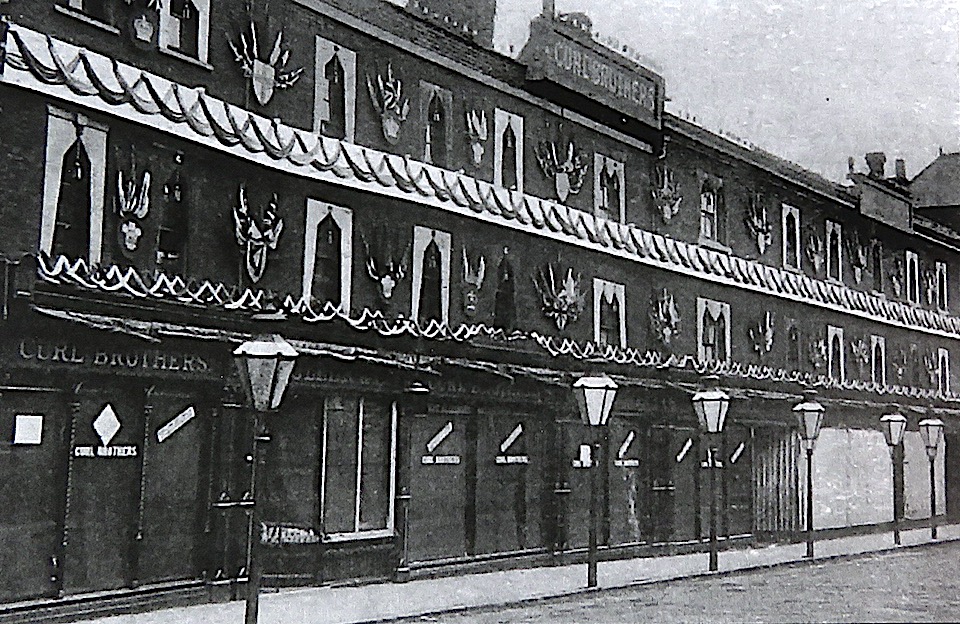 The Rampant Horse Street facade of Curls illuminated by 11 Ediswan lamps, ‘each being of 200 candlepower.’ Shop decorated for Queen Victoria’s Diamond Jubilee, 1897. ©Norfolk Industrial Archaeology Society.
