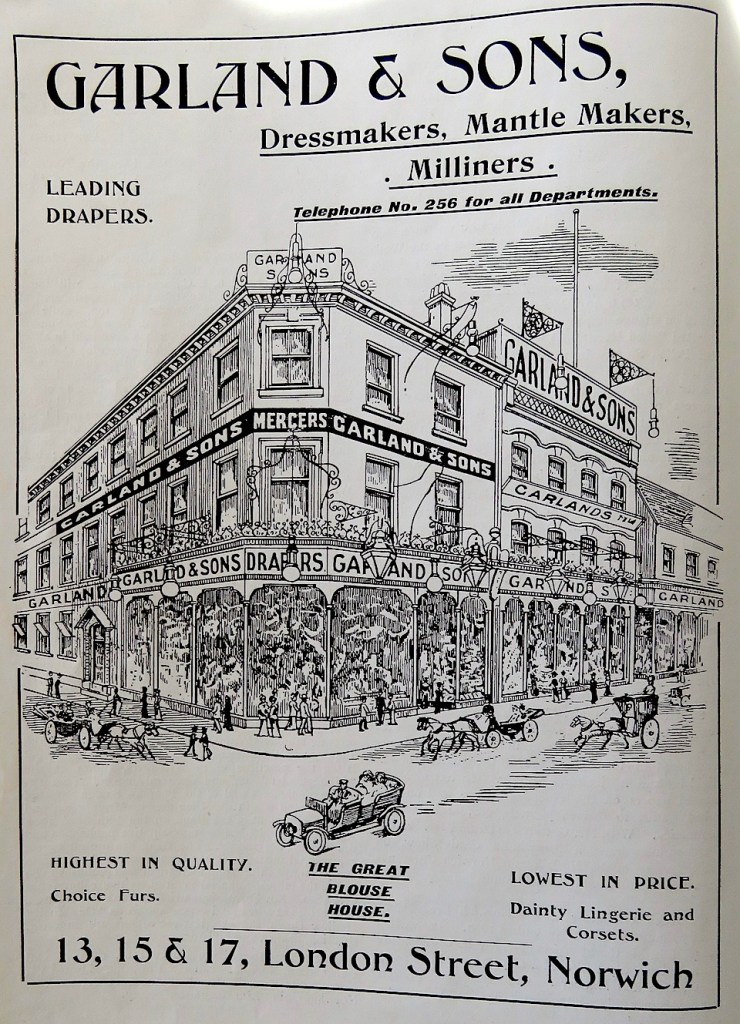At 15, Richard Garland had been an apprentice draper in the London area. His own store in Norwich was to specialise in drapery but we see from this advertisement that Garlands were also dressmakers, mantle makers and milliners who sold ‘choice furs’, ‘dainty lingerie’ and corsets.