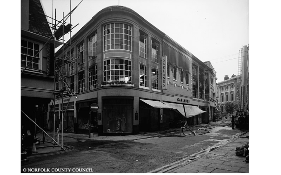 Garlands after the 1971 fire. The gutted building shows the modernisation that had taken place since the 1935 silver jubilee. The building just visible to the left, with C17 gabled dormers, was then owned by gents’ outfitters Dunn & Co; it is now part of Jarrolds Department Store. ©Norfolk County Council at Picture Norfolk
