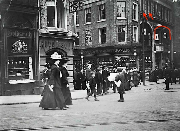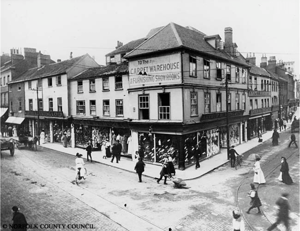 Buntings in 1909, in the age of the electric tram. St Stephens Street to the left, Rampant Horse Street to the right. © Norfolk County Council at Picture Norfolk