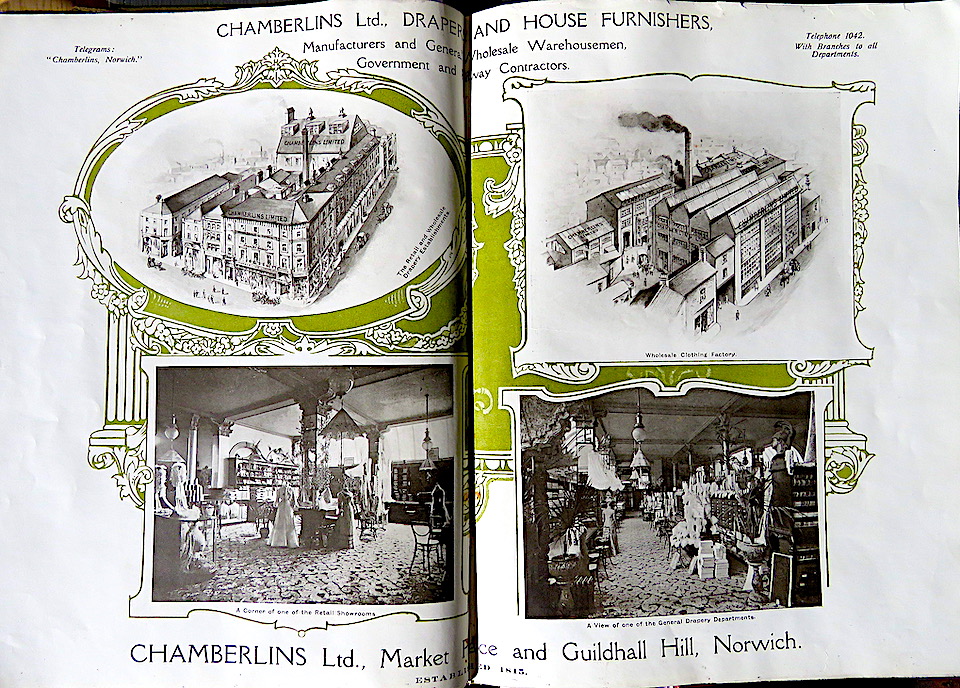 According to Mason’s Directory of 1852, Chamberlin (Henry) Sons & Co were ‘Wholesale and Retail Drapers, Market-Place’ [4]. Henry Chamberlin founded the business in 1815. His descendants became members of the local establishment: Mayor, Sheriff and Deputy-Lieutenant of Norfolk. Some idea of the extent of their enterprise can be judged from the centre spread of this 1910 trade book [5].