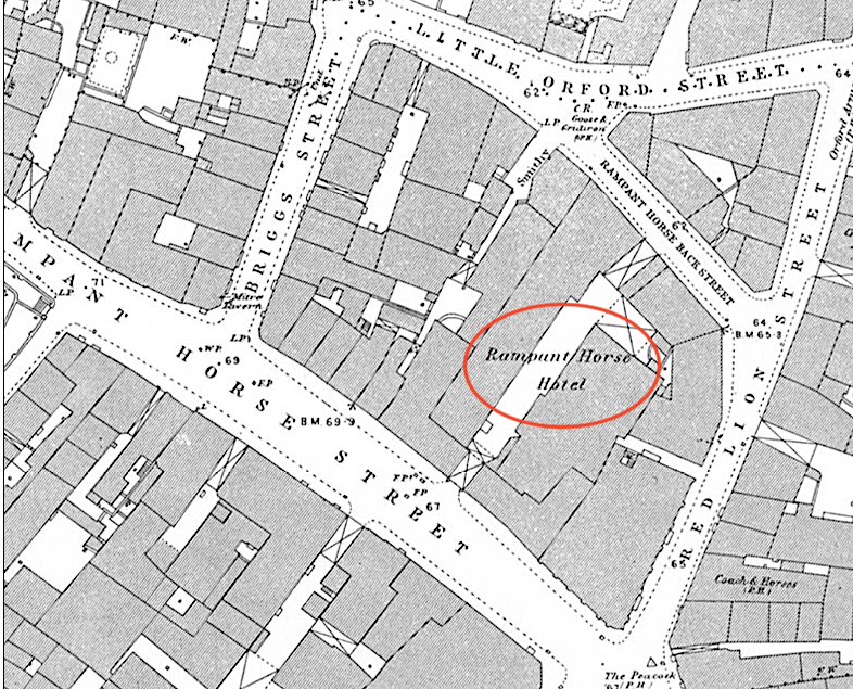 The site developed by the Curl brothers around the Rampant Horse Hotel. OS map 1884 courtesy of norwich-heritage.co.uk