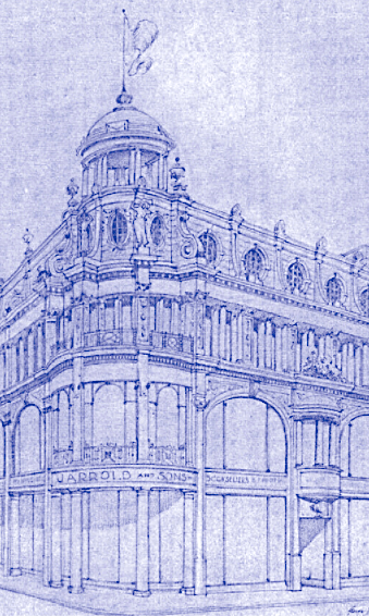 ‘The Great Blouse House’, 1910, from [5]. Little London Street (‘Back of Jarrolds’) is to the left, London Street to the right