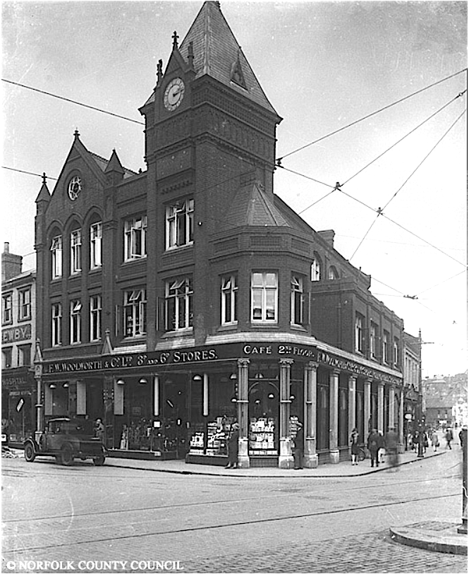 The original 1914 Woolworths 3d and 6d store (seen here in 1924) at the corner of Rampant Horse Street and Red Lion Street. Another store (‘EWBY’, Newby?) is to the left. ©Norfolk County Council at Picture Norfolk