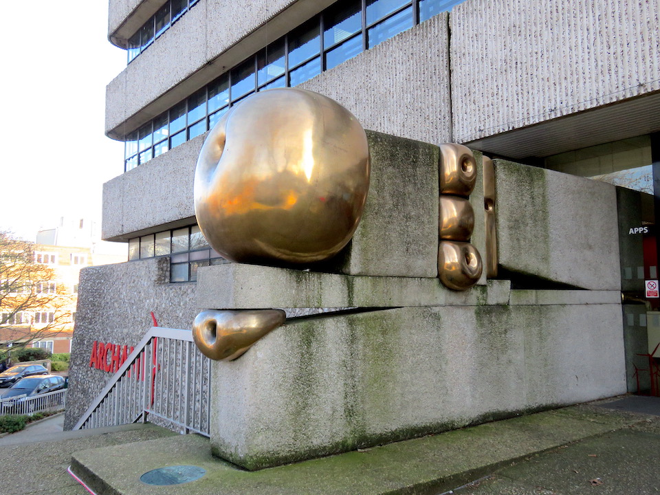 At the right-hand edge of the map is Prospect Place Works that manufactured agricultural machinery for Holmes & Sons’ beautiful cast-iron-and-glass Victorian showroom (now the Crystal House) on the hill at Cattlemarket Street. This area was to be reconfigured, first by German bombs then by the bulldozers of postwar renewal. In 1962, the Golden Ball pub was compulsorily purchased and, along with Rising Sun Lane, flattened to form a wider, realigned route (Rouen Road) that bypassed narrow King Street. The name ‘prospect’, which must refer to the view across the valley to the Thorpe side, lives on in Prospect House, built in 1970 as the headquarters of Eastern Counties Newspapers. Golden Ball Street remains and the golden globe that once hung over the corner of that street is reimagined in the sculpture by Henry Moore’s assistant, Bernard Meadows, outside the ECN building. Norwich boy Meadows – who would have known the old street and the pub – resurrected the golden ball, now playfully prodded by the apprentice whose master’s works were famously holey and bumpy.
