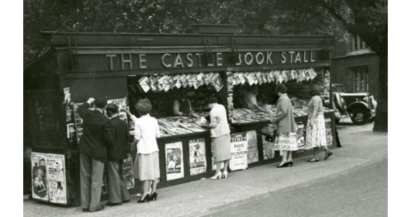 By tweaking the signage on the stall, to the left of the figures on Spencer’s drawing, it is possible to make out the name ‘Castle Books’.