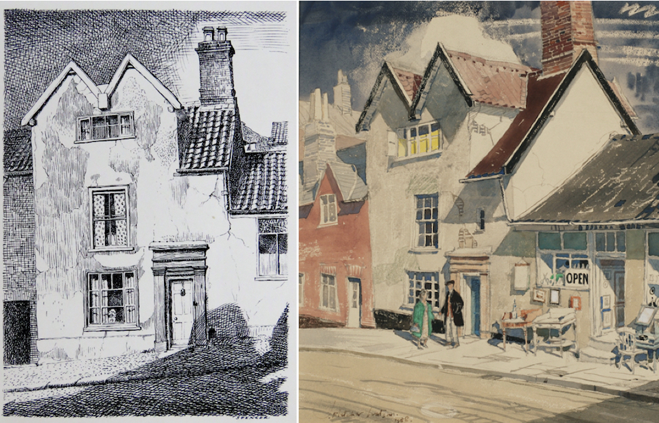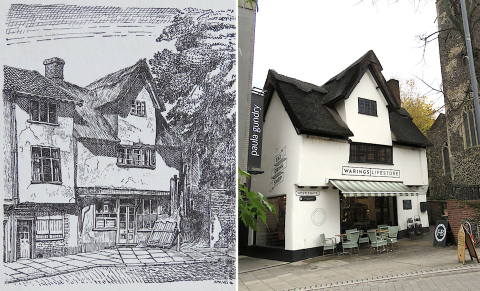 In the postwar period, Spencer drew one of only six thatched houses in the city – the sole timber-framed house on Westlegate to survive the twentieth century transformation. The house to the left was demolished to make way for Westlegate Tower.