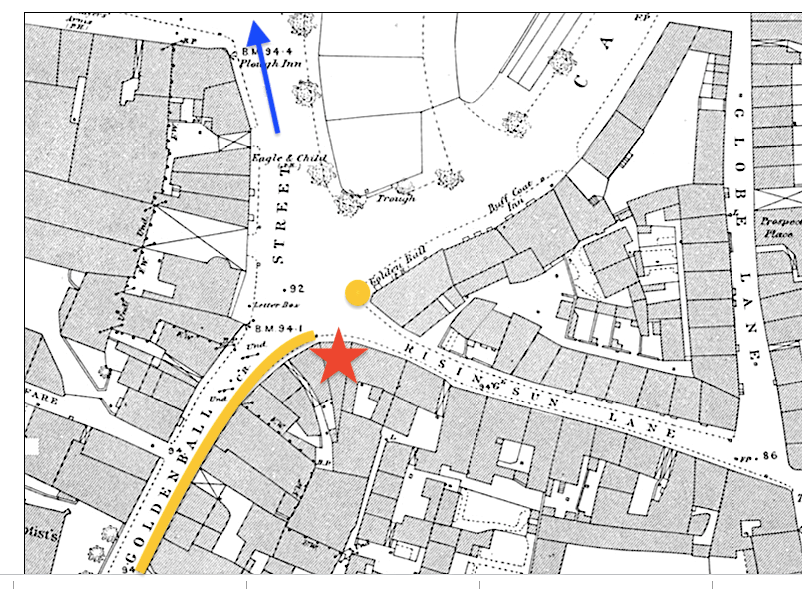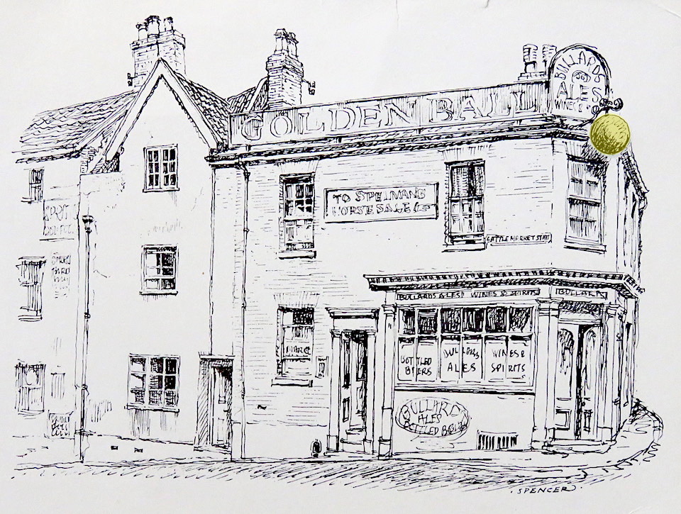 The OS map of 1884 shows the Golden Ball pub at the top of Cattlemarket Street at the three-way junction with Golden Ball Street and Rising Sun Lane.