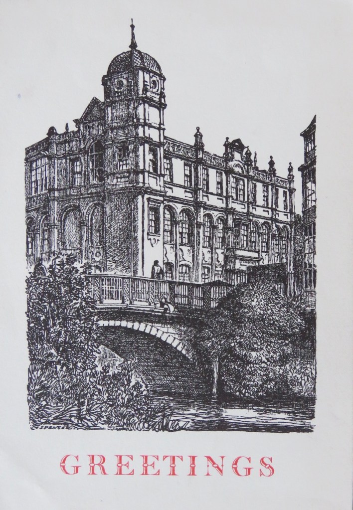 This ink drawing on one of Noël Spencer’s greeting cards is labelled ‘The Norwich Technical Institute. Now the City College and Art School, built beside the Wensum in 1899. Sir John Soane’s Blackfriars Bridge in the foreground.’ Soane built the bridge of Portland stone in 1783-4.
