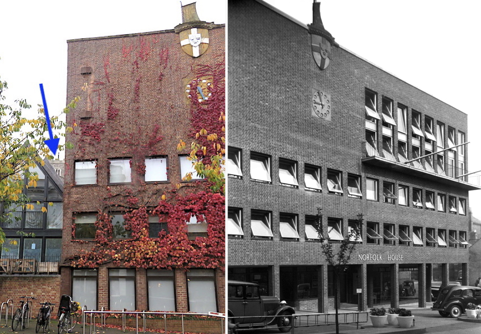 1951 was the year of the Festival of Britain, a ‘beacon of change’ for a country recovering from a debilitating war. It was also the year in which the 11-year-old twin King brothers dedicated the forward-looking Norfolk House on this bomb site. Impressed by Halmstad City Hall in Sweden, their father, Raymond King, was determined to introduce a similar note of modernity to Norwich [8]. In spirit, if not in detail, this new building also bears comparison with Norwich’s own City Hall of 1939, which was influenced by Stockholm’s neo-Classical City Hall and Concert Hall. When completed, Norfolk House obscured all but the tip of St John’s tower from Exchange Street.