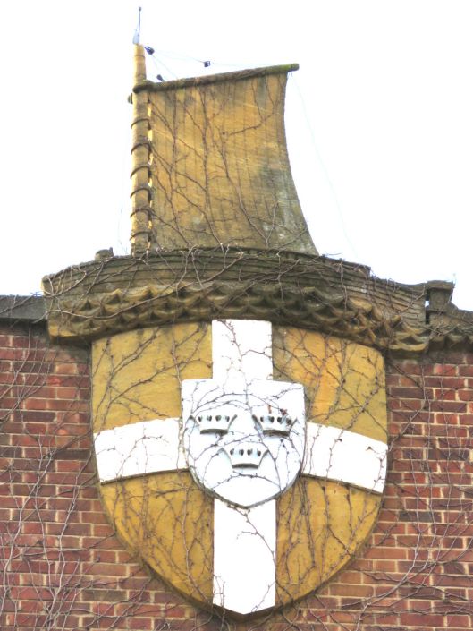 Breaking the roofline of the Halmstad City Hall is a sculpture of a man o’ war surmounting a clock (not shown). On Norfolk House this theme is transmuted into the shield of the kingdom of East Anglia topped by a Norfolk wherry.