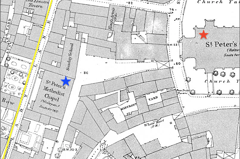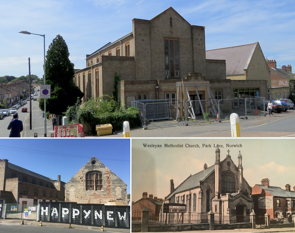 Tumblers clicked when I realised that St Peter’s Chapel at the junction of Park Lane and Avenue Road was built as the direct successor to St Peter’s Chapel in Lady Lane. In 1939, as the latter was being marked for destruction, Boardman & Son were supervising its replacement in the Golden Triangle [7]. Currently, the ‘new’ St Peter’s is being converted to apartments. It was built adjacent to a smaller Wesleyan Methodist chapel of 1894 that was evidently stripped of its neo-Gothic identifiers when it was encased in brick and repurposed as the church hall. About two years ago those bricks were removed, revealing a Neo-Gothic window.