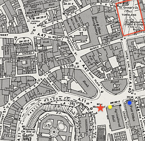 Spencer viewed the scene from across the road, from the first floor offices of local architect Ernest Hugh Buckingham (1874-1962). This would have been in a three-storey, round-cornered early C19 building on the site of the ancient Popinjay Inn, roughly where the devastating fire of 1507 started [6]. That building is no longer with us for the corner was presumably demolished as part of the post-war programme of street-widening. The site is now occupied by the bar/restaurant, All-Bar-One. I asked if I could go upstairs to photograph the former building site from Spencer’s vantage point but was told this wasn’t possible. All-Bar-Me then.