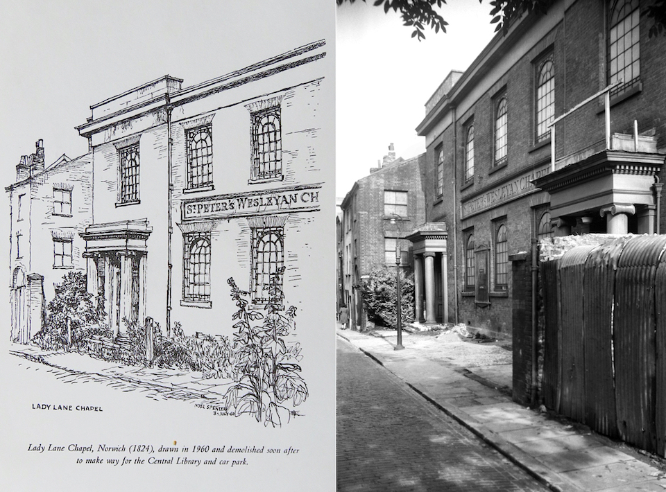 In 1960 Noël Spencer recorded the Lady Lane Chapel with his pen as George Plunkett had done with his camera in 1949. This chapel had been designed by John T Patience in 1824 in the same period that he designed the Friends’ Meeting House in Upper Goat Lane (1824) and the Roman Catholic Chapel in Willow Lane (1828) [6].