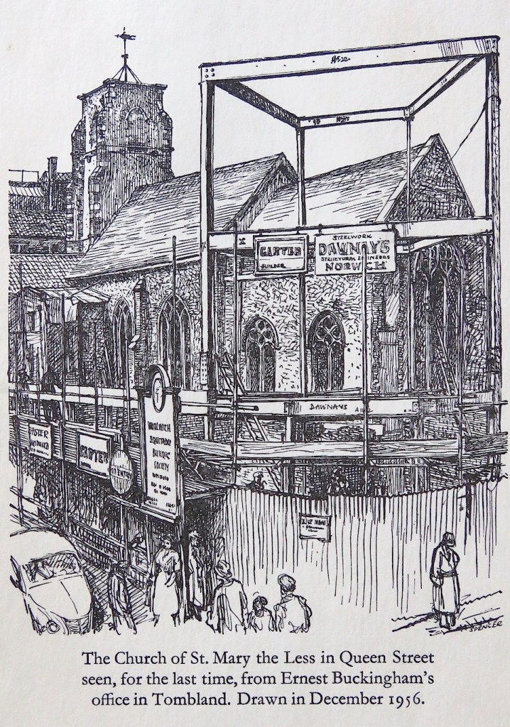 Another of Spencer’s drawings records a bomb site being levelled in 1949. Trevor Page’s Norfolk Furnishing Establishment had made and upholstered furniture here until it was bombed during a Baedeker raid in August 1942; its loss allowed St John Maddermarket to be seen from Exchange Street [6]. To the far right of the illustration, beneath the tree, we see the stippled wall of the churchyard. This boundary wall was rebuilt in 1578 after land had been borrowed from the crowded graveyard to widen the lane so that Queen Elizabeth I could be conveyed from the Guildhall to the Duke of Norfolk’s palace on the riverside.