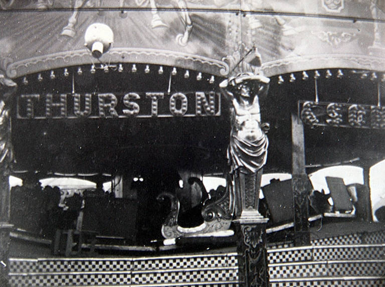 Look closely and you can see these supporting figures to have been lit by strings of light bulbs, showing them to have been a fairground attraction. Until the seventeenth century the annual Tombland Fair was held on the Thursday before Easter but for most of the twentieth century ‘Tombland Fair’ was held at Christmas and Easter on the spaces around the Castle mound (e.g., Cattlemarket Street, Castle Meadow, Market Avenue) [12]. The classical portico (circled) down the road belongs to the old Crown Bank (later the Post Office) next to the Agricultural Hall, meaning that the fairground ride was located at the southern border of Agricultural Hall Plain, adjacent to the hall itself.