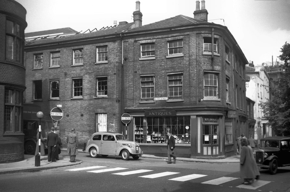 In 1954 George Plunkett photographed Plowright’s antique shop at the corner of Tombland and Queen Street. The dilapidated state of the adjacent building is explained by Plunkett’s description of an enemy raid in May 1943 when incendiary bombs gutted Bell’s the estate agents and ‘Plowright’s the antique dealers’ premises next door suffer(ed) severely from blast which scattered and smashed a quantity of valuable silver and glassware.’ [6]
