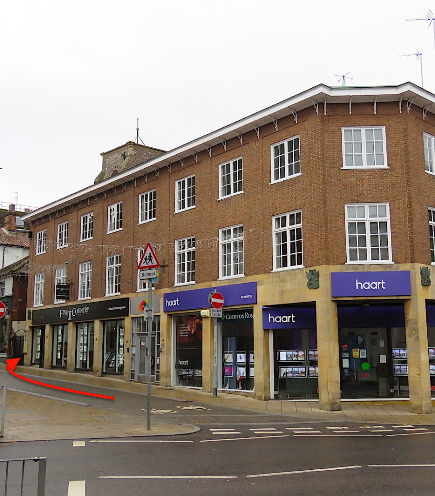 Despite the inconvenient shuttering around a former jewellers we can see that Tombland curves away to the right and not to the left as in Spencer’s drawing.