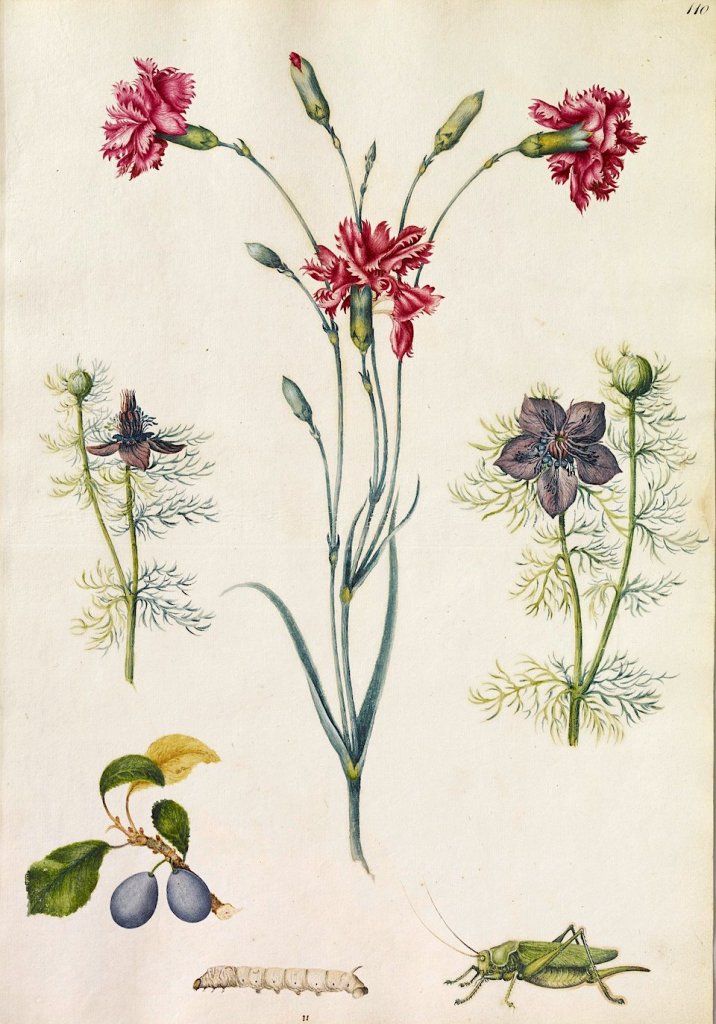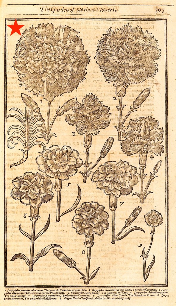 Plate 307. from Parkinson’s ‘Paradisi in Sole, Paradisus Terrestris. Top left is ‘Caryophyllus maximus rubro varius, the great old Carnation or gray Hulo’. Courtesy of metmuseum.org