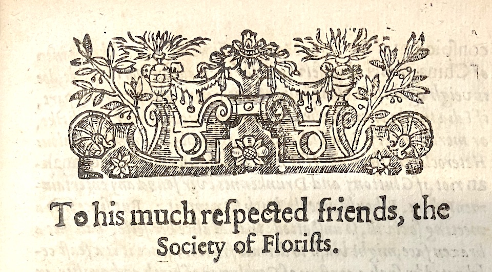 As well as glimpses into the tangled love lives of Eglantine, Violetta, Clematis, Gladiolus et al we learn that a Society of Florists existed in 1631, which appears to be its first mention in England. The author’s preface also refers to the Society of Florists as ‘a conflux of Gentlemen of birth and quality in whose presence and commerce (I thinke) your cities welfare partly consists.’ Not entirely sons of the soil.