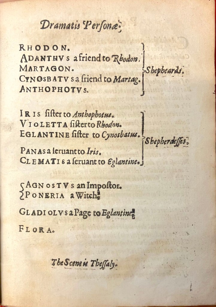 Knevet (1600-1671), member of a Norfolk landed family, Rector of Lyng and friend of the Paston family, was described as a ‘learned and spasmodically talented poet’ [10]. The dramatis personae for Rhodon and Iris gives an idea of the high-flown tone of the play in which flowers appear as the major characters.