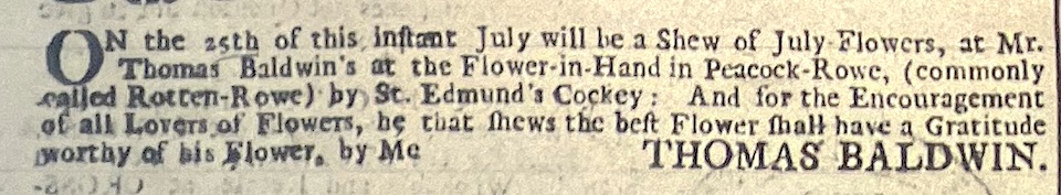 The advertisement by the Sons of Flora in the figure at top of this post was published when carnations were in bloom but since no invitations were made to bring flowers, nor prizes offered, it would appear that this was an exhibition, a ‘Shew’. On the 24th July 1729, one day after the Sons of Flora met in the Maid’s Head, Thomas Baldwin held his own show in the Flower-in-Hand public house, this time offering a ‘gratitude’ for the best July-Flower, as carnations were called.