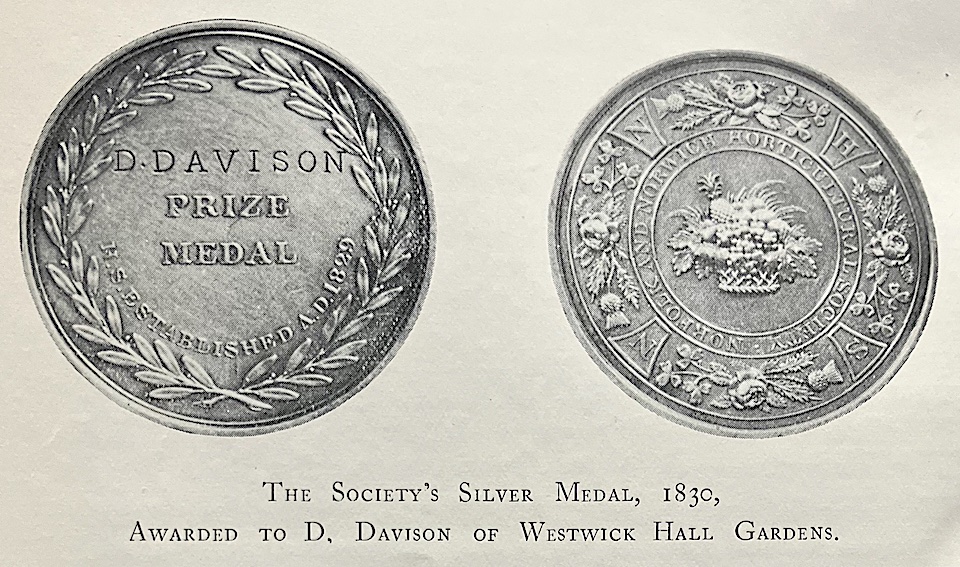 Since the ‘class of persons to whom prizes might be awarded would not be willing to accept a pecuniary acknowledgement, the Society would have a medal of its own.’ Accordingly, in 1830, Leonora Norgate of Hethersett Old Hall designed a medal to be struck in silver and bronze and, later, gold. However, two years later it was agreed that winning gardeners (i.e., Cottagers) could accept silver spoons in lieu of a medal ‘as a valuable and useful appendage to his household cupboard or his wife’s tea-board.’