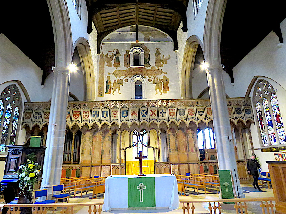 The large stone columns and rounded arches of the Norman period contrast with the fine stone ribs of the fan-vaulted ceiling of the 1460s, which replaced the fire-damaged wooden roof.
