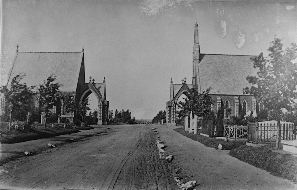 Mortuary chapels: Dissenters’ chapel to the left, Established Church to the right. Courtesy of Peter Bentley Wilson.