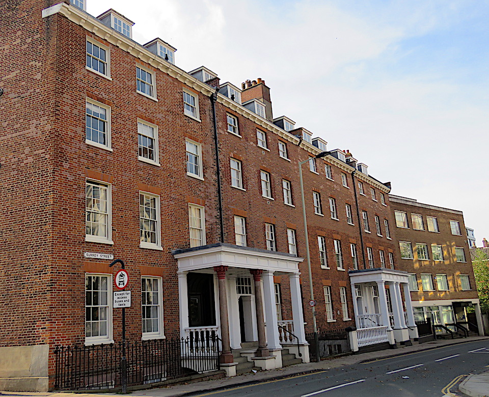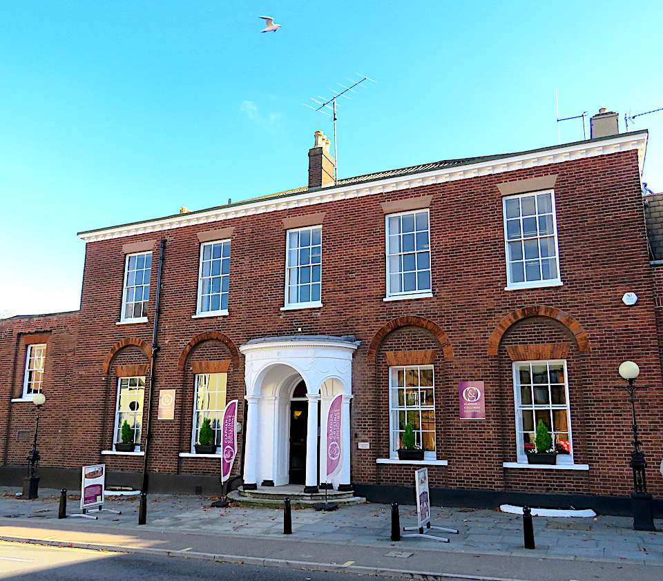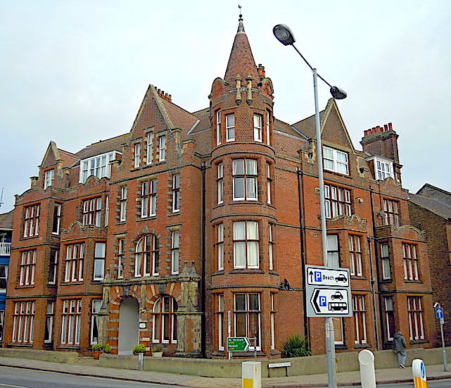 The other corner of the London Street Improvement, at the junction with Castle Street, is currently home to Whittard of Chelsea. Built in 1880, its surface is also decorated with Cosseyware brick diapering – a feature the architect repeated in other projects, including The Royal Hotel (see below). While it differs in detail from the building at the other end – notably in the design of the window heads – both are built of red brick in a free Victorian Gothic style that promised a coherent approach to this block on London Street.