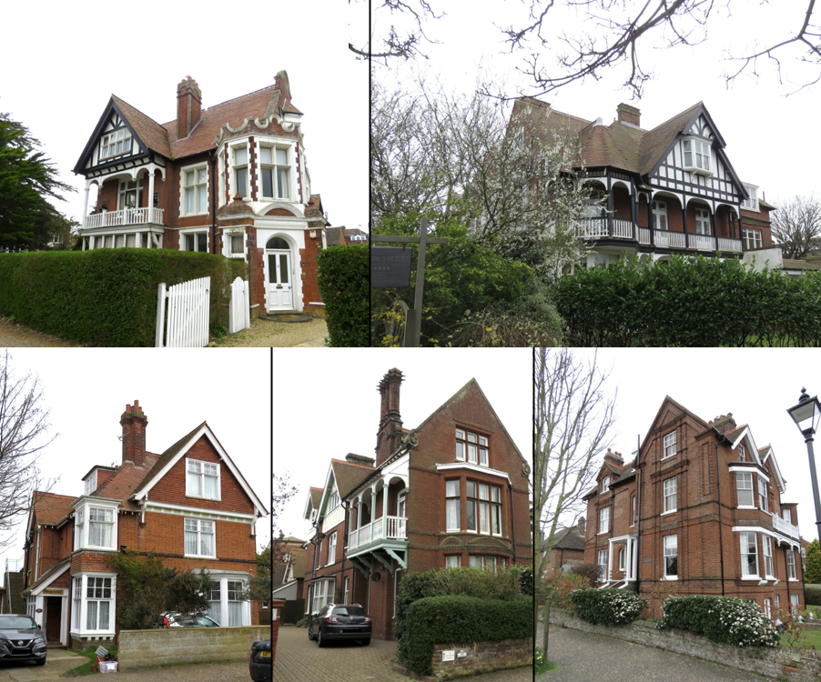 The suburbs of an expanding Victorian city were well served by the trams. The area immediately to the south west of the city had begun to fill with terraces after the sale of Unthank land in the mid-nineteenth century [15]. As a practising solicitor, Clement William Unthank had drawn up detailed covenants to preserve the appearance of terraces built on his land: to be faced in good white bricks; doorways arched in bricks; no gable peaks to the front of the house; nothing to project more than 18 inches from the building line etc. These were humble terraces whose austere frontages lent a Classical appearance. But the land on the Eaton Glebe Estate, further along Unthank Road, had belonged to the vicar of Eaton, leaving architect Arthur Betts free to design substantial red-brick villas in College Road with ‘the most unusual “cottagey” Gothic details’ [2], such as half-timbered attic gables and moulded brick string courses.