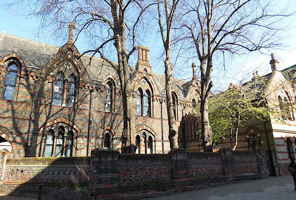 The lower levels are unadorned, but as you gaze upwards the extravagances of the Flemish Renaissance Revival come thick and fast in the form of ornamental brickwork (here, Cosseyware) topped off with pointed gables, towers and verdigris’d pinnacles [5]. As we will see, the busyness was antithetical to the plainness of Boardman’s industrial buildings.