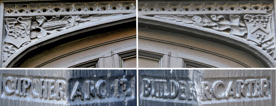 This eclectic Arts and Crafts style is not typical of Edward Boardman’s output and may have something to do with the influence of his son, Edward Thomas [4]. The three projecting bays contain cartouches bearing dates: 1844, 1900 and 1960. The present building is of mellow stone on a dark granite base but in 1899 Boardman seems to have specified a different combination with a base made of Carrara Ware.